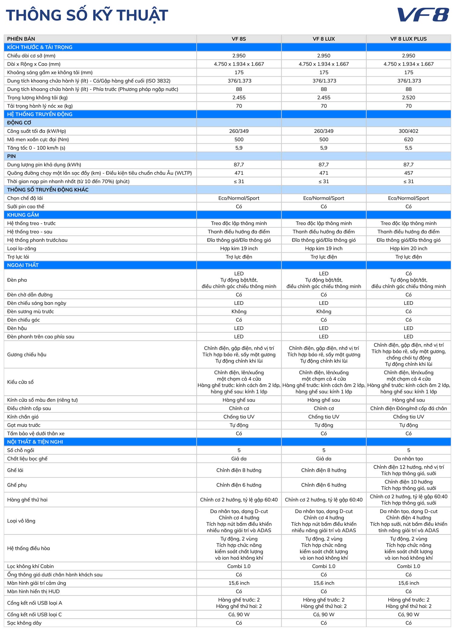 VinFast VF 8 với thiết kế mới sang trọng và công nghệ vượt trội. Với nhiều điểm nổi bật: ngoại thất nhiều màu, công nghệ trợ lý ảo Vivi 2.0 mới, ADAS và VF Connect. VinFast VF 8 có hai tùy chọn là phiên bản VF 8 Eco và phiên bản VF 8 Plus, trong đó phiên bản VF 8 Eco được trang bị động cơ điện có công suất 350 mã lực, đi được quãng đường 471km/lần sạc đầy, trong khi phiên bản VF 8 Plus có sức mạnh lên tới 402 mã lực, đi được quãng đường 457km/lần sạc đầy.